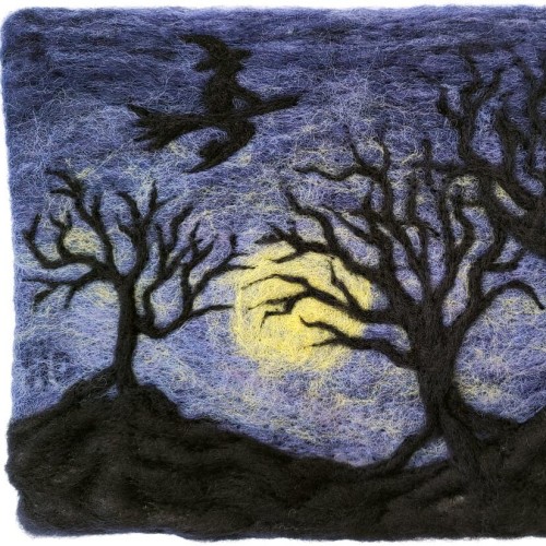 We will use wool sourced from Maine fiber farms to learn multiple needle felting techniques to transform puffy piles of wool into a seasonal landscape with a full moon, spooky trees and rolling tree roots that feature dark shadows with 3D depth. You can add a flying witch if you want to add a little extra flair!